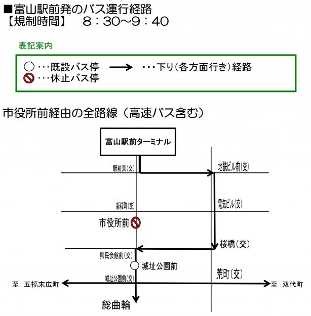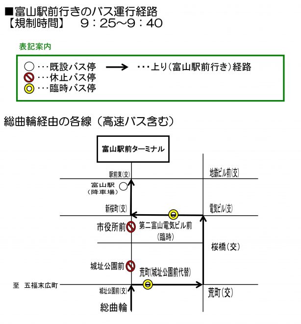 ・富山駅方面行きのバスは9:25~9:40の間、経路変更し