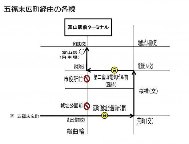 城址公園前、富山市役所前を経由致しません。