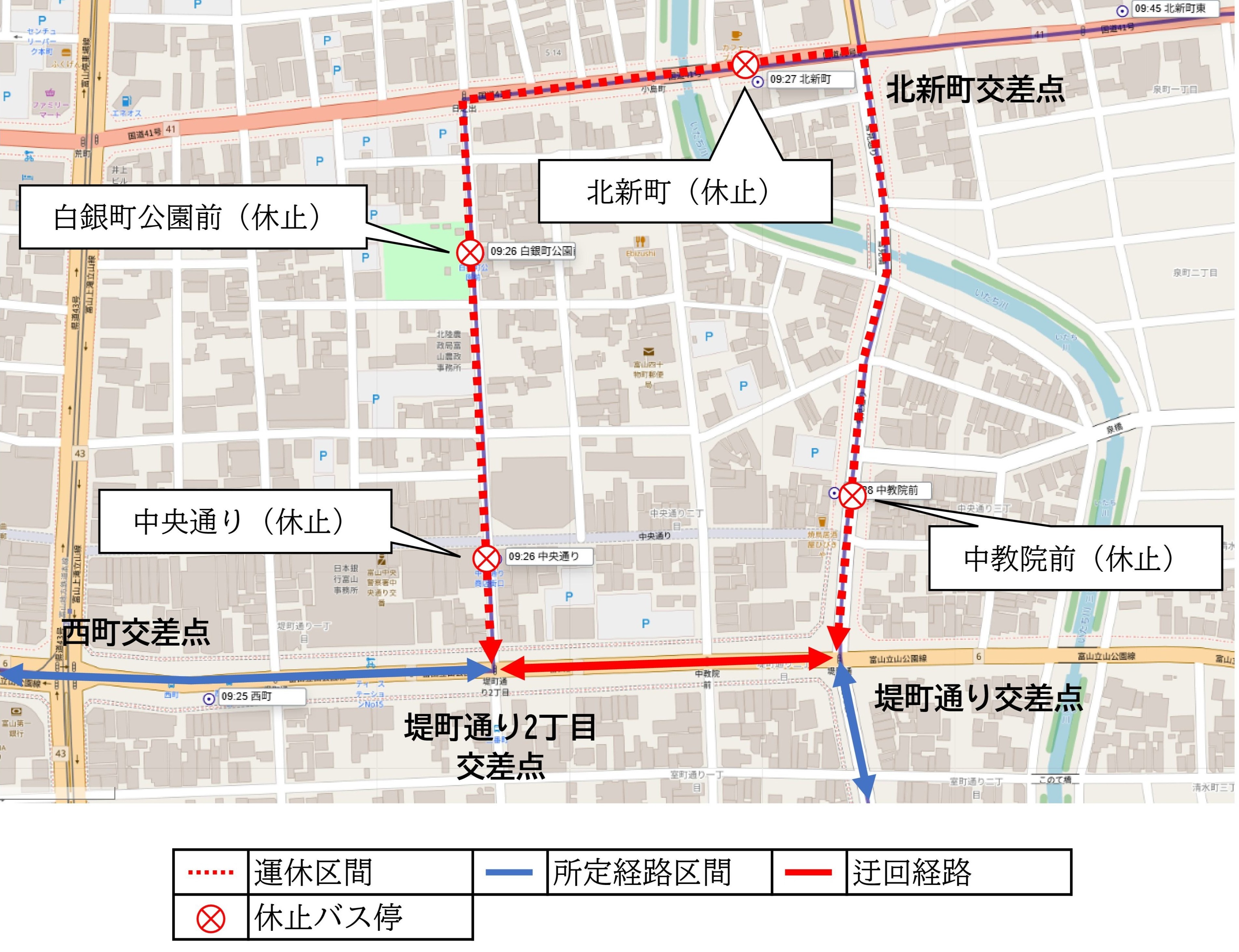 下図の通り、中教院前~中央通りバス停を休止し、迂回運行いたします。