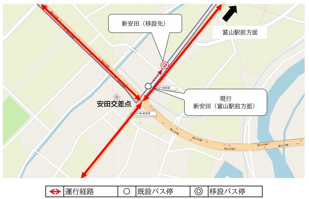富山市安田地内の水道工事に伴い、下記の通り「新安田」バス停を一時移設いたします。