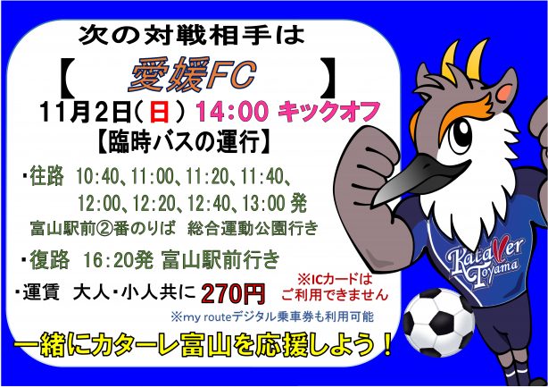 11月2日(日)『カターレ富山 VS 愛媛FC』ホームゲーム開催臨時バス運行