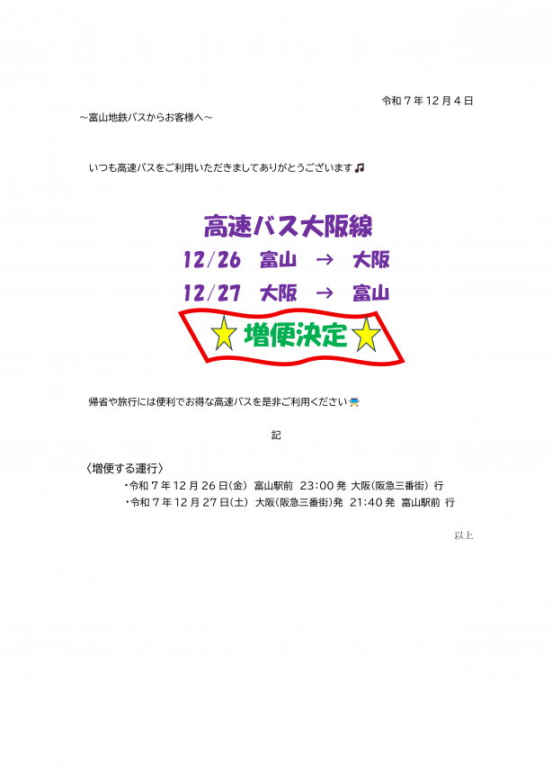 「富山ー大阪線」12/26富山発・27大阪発 増便運行について