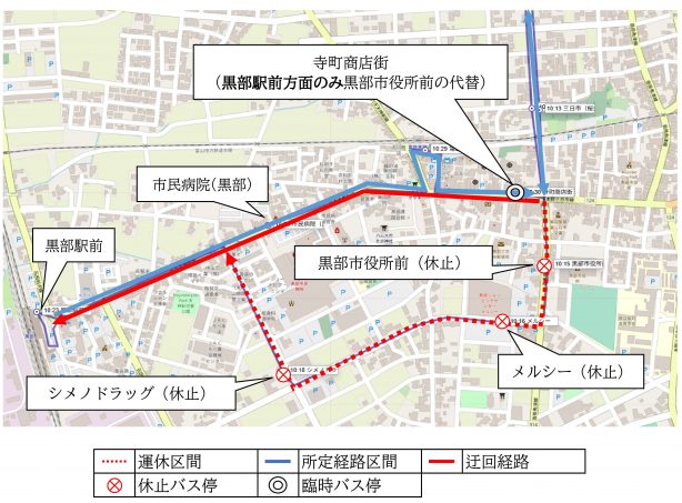 黒部市役所前~シメノドラッグ間を迂回運行しますのでご注意ください。