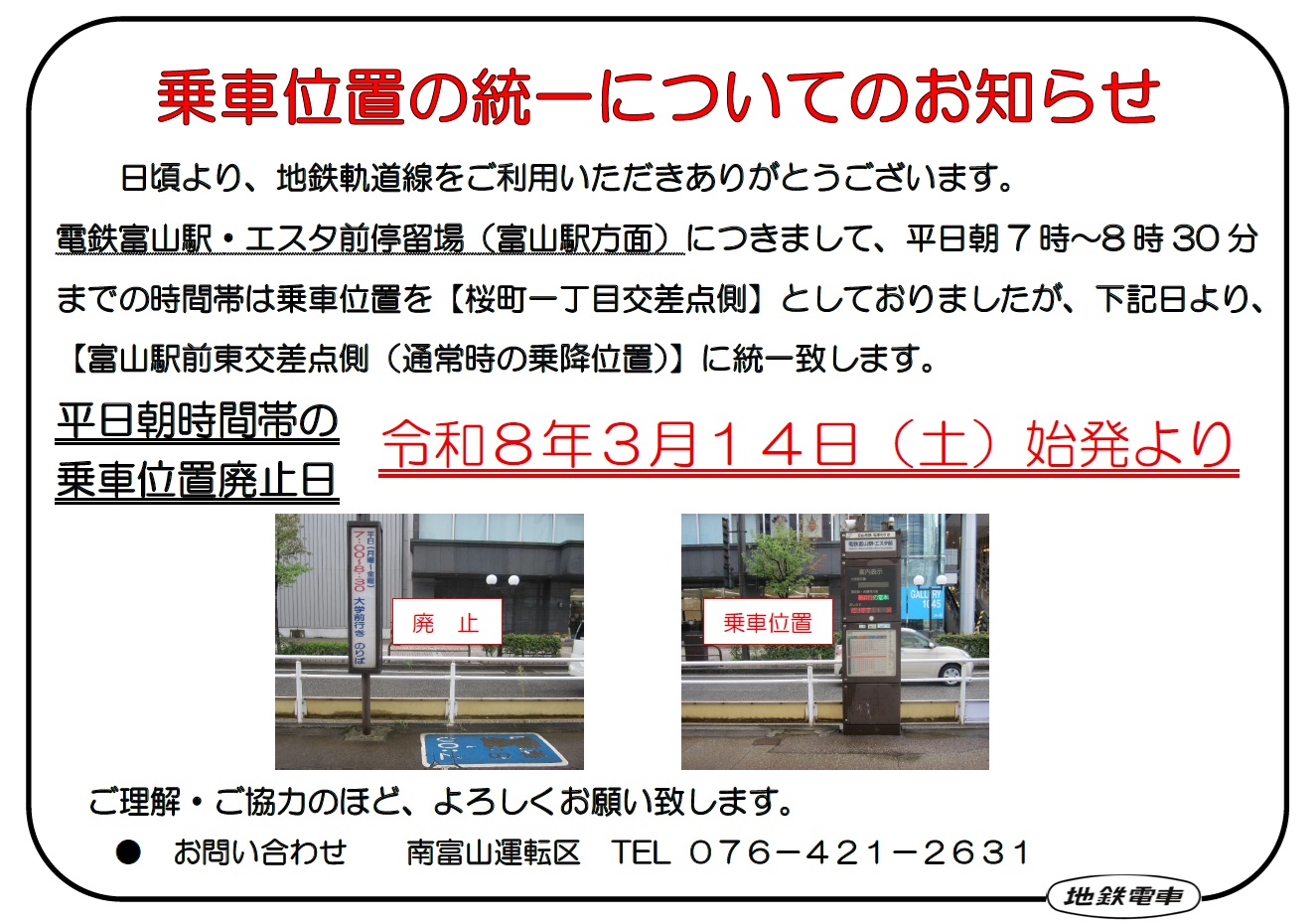 電鉄富山駅・エスタ前停留場(富山駅方面)の乗車位置の統一について