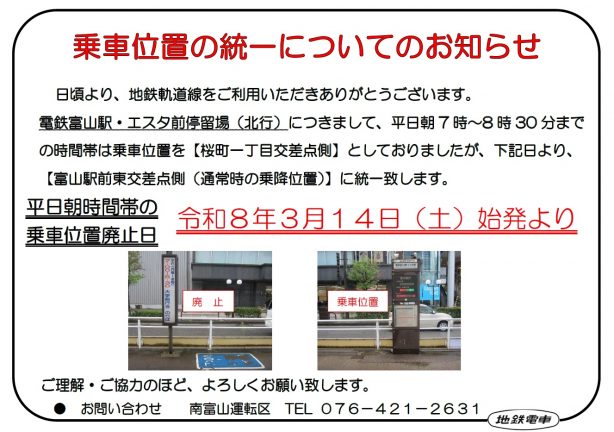 電鉄富山駅・エスタ前停留場(北行)の乗車位置の統一について