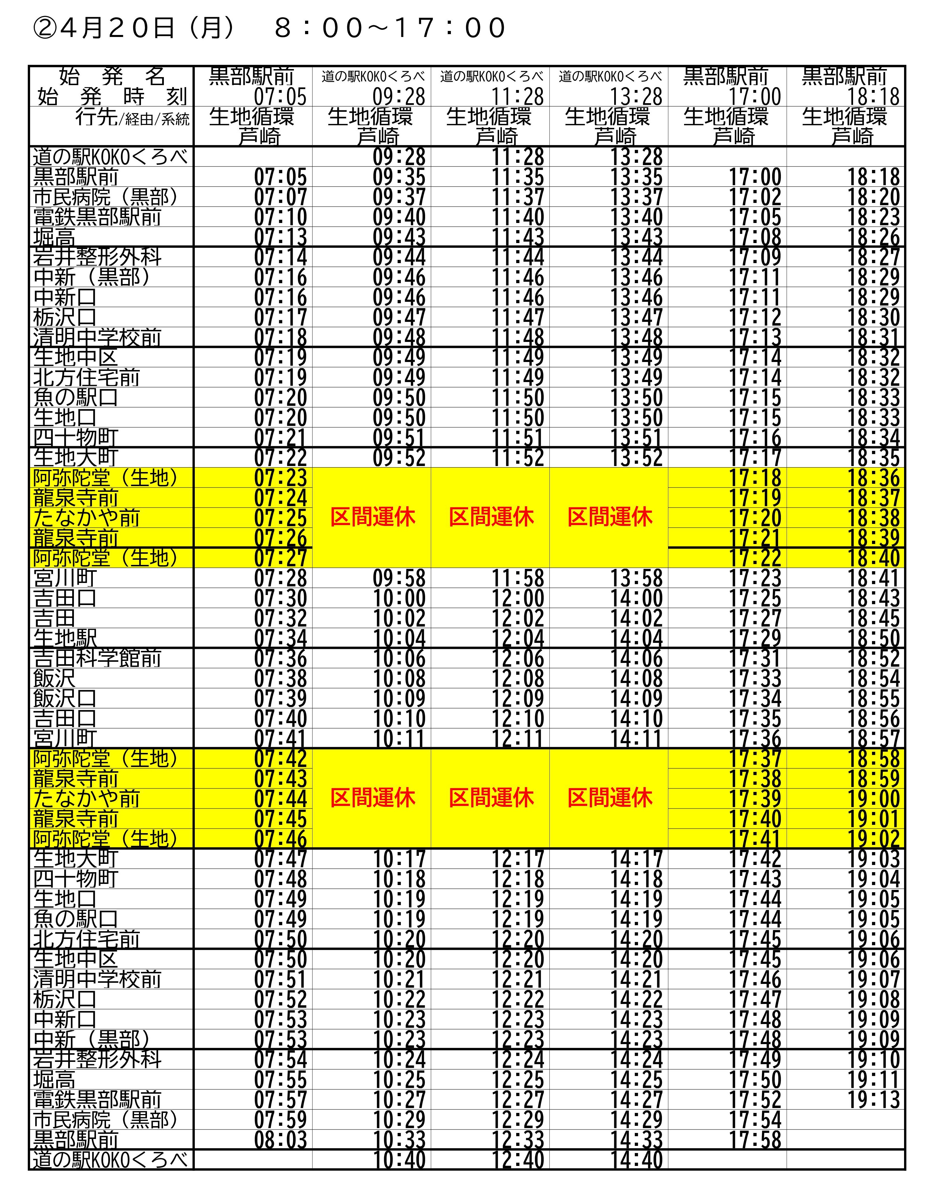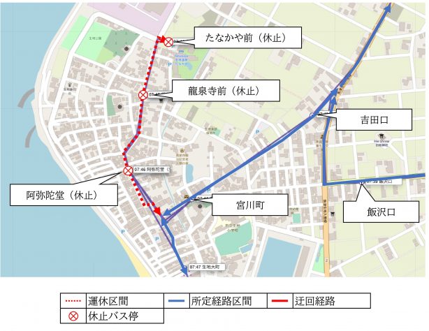 阿弥陀堂~たなかや前バス停間を区間運休し、下図の通り区間変更いたします。