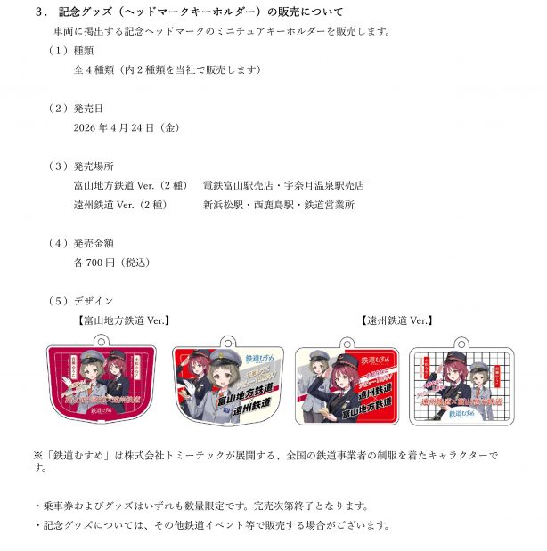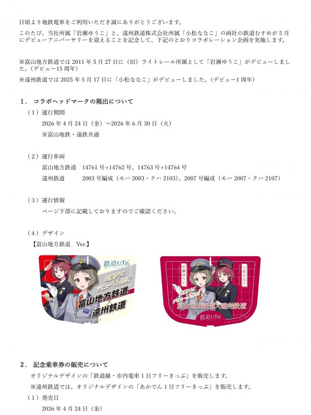 富山地方鉄道「岩瀬ゆうこ」×遠州鉄道「小松ななこ」 鉄道むすめデビューアニバーサリーコラボレーション企画について